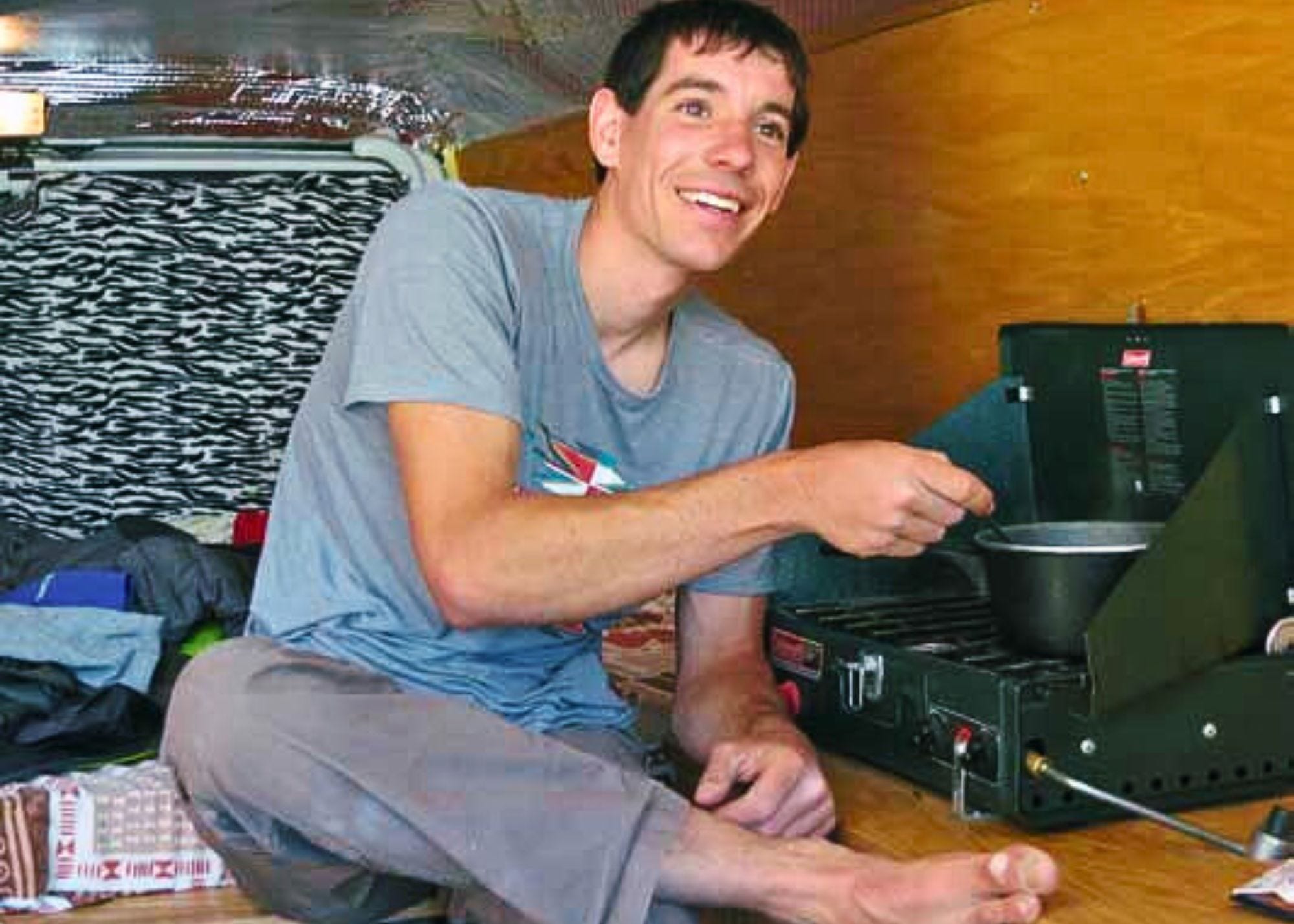 A materialist would milk his fame, and pursue a van sponsor, at least. “But this van works fine!” he says. “And we’re way too consumerist in this country, anyway.” Besides, he doesn’t love being a celebrity. “It’s funny to get sick of people telling you how inspiring you are, but I mean, it’s just rock climbing. I didn’t save the world.”