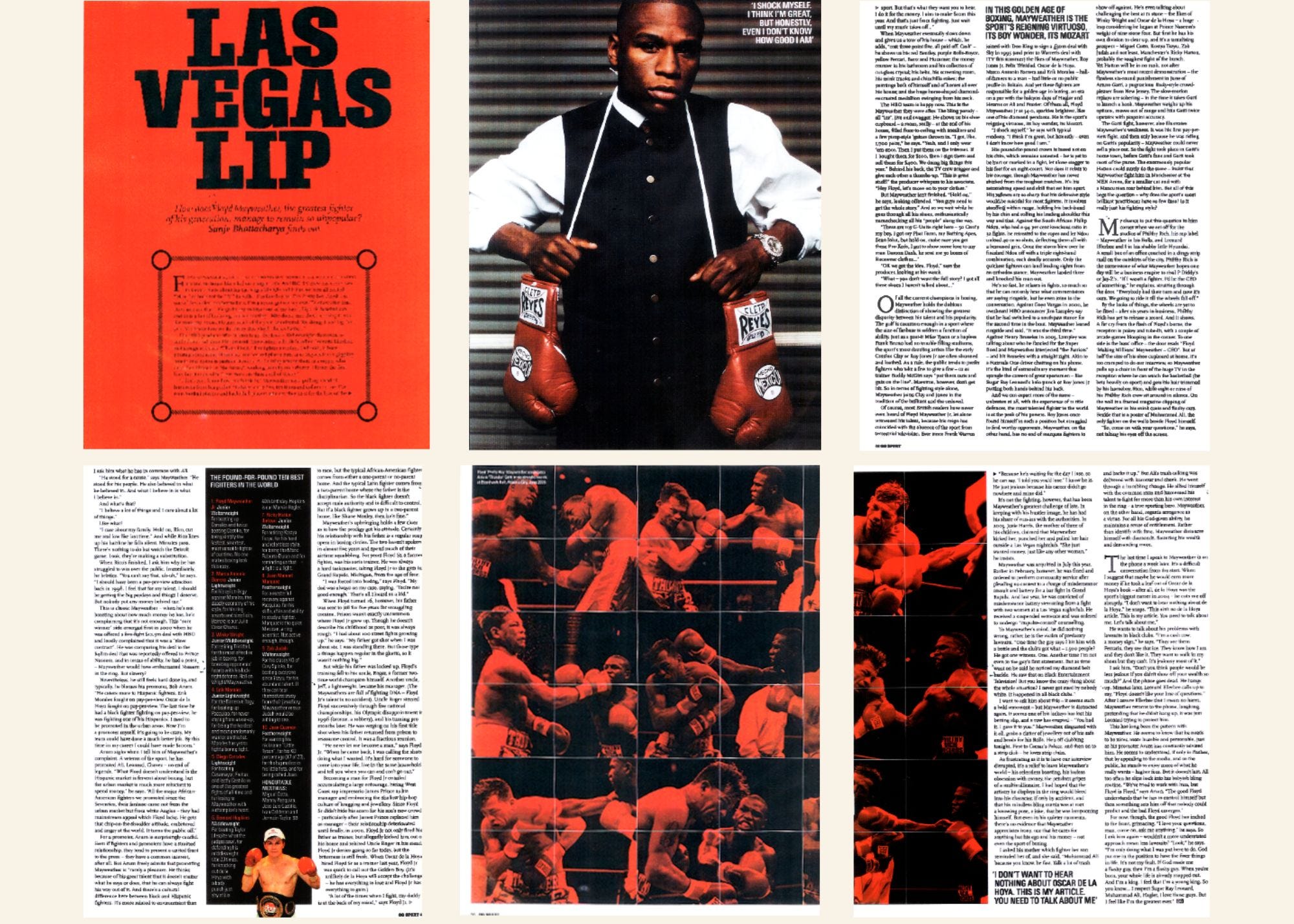 I asked about his rift with his father, which next to mine, was of a different scale entirely, mythic in the way that both men were fighters, with the same name, Jr and Sr, the son trained by the father. It started when Floyd was 16 and Sr went to prison for five years on a cocaine charge. “My career blossomed when he got locked up,” he told me. “But when he came back, he still wanted to tell me when I can and can’t go out. He couldn’t accept that I call the shots now.” So Floyd fired him as his trainer and they’d been talking trash at public events ever since. But Floyd shook it off. He’d surpassed his father in every way. He was the greatest fighter in the world. “It’s not that I hate him, he just never let me become a man,” he shrugged. “He do him, and I do me.”