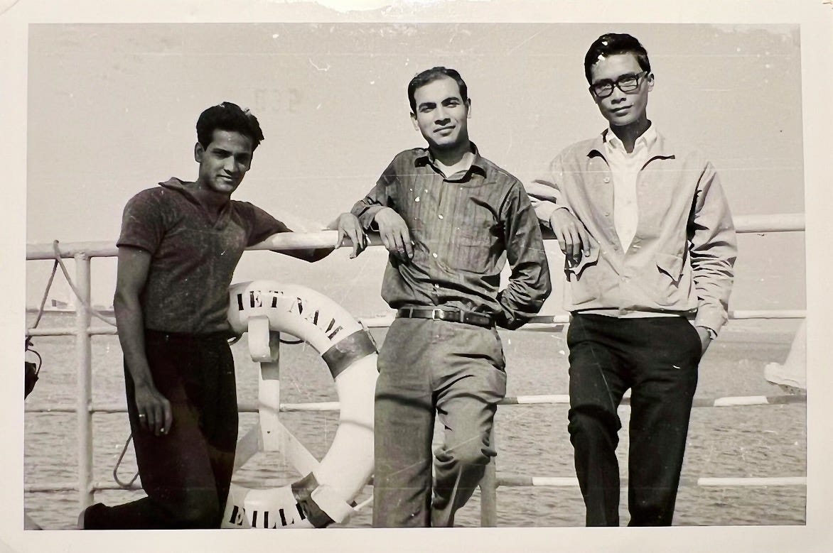 That’s my father in the middle, with two of his travel companions on the ship that brought him from India to London. It was the 1960s, I wasn’t born yet, and he wasn’t married. Just a young man heading west, as I would decades later, from London to LA, at around the same age, too, about 29 or so. Who can explain these symmetries? Like history rhymes, so do families.