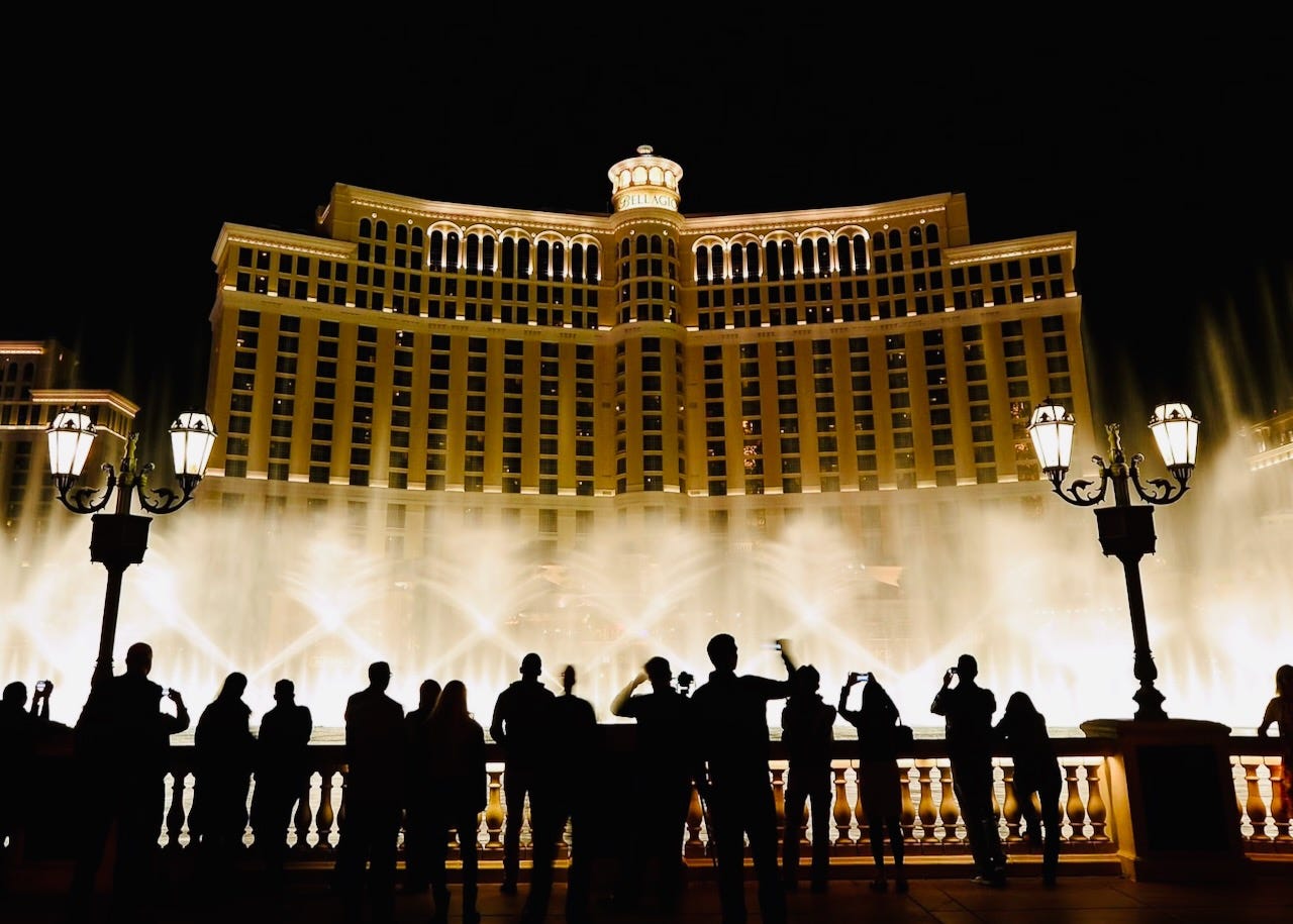 We reached the Bellagio, at the lip of the lake out front, and people were gathering at the barrier, waiting for the show.